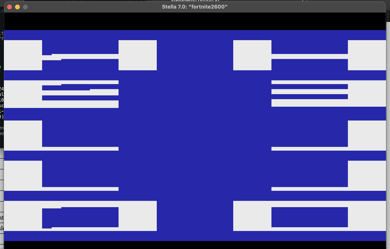 But I'm getting ahead of myself. Getting something on the screen was the hardest part of the project, which was kind of the point: I wanted to see if a modern LLM could even build workable 2600 code. There was about half an hour of getting things like this: